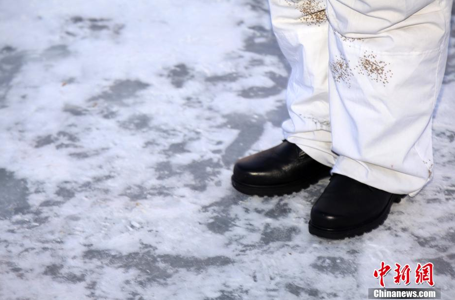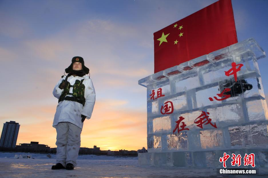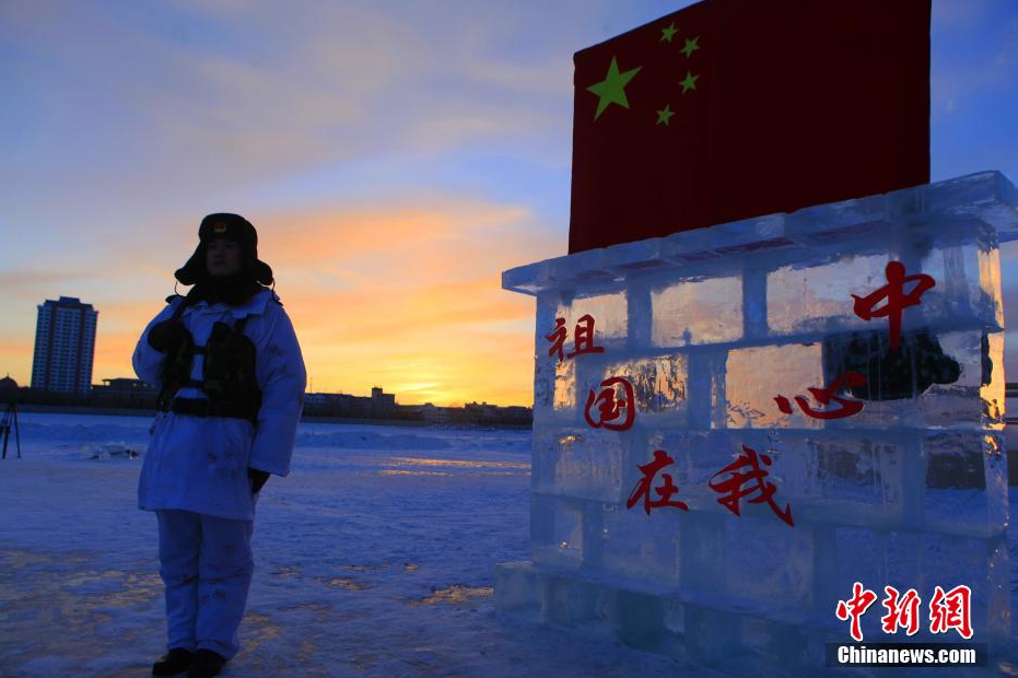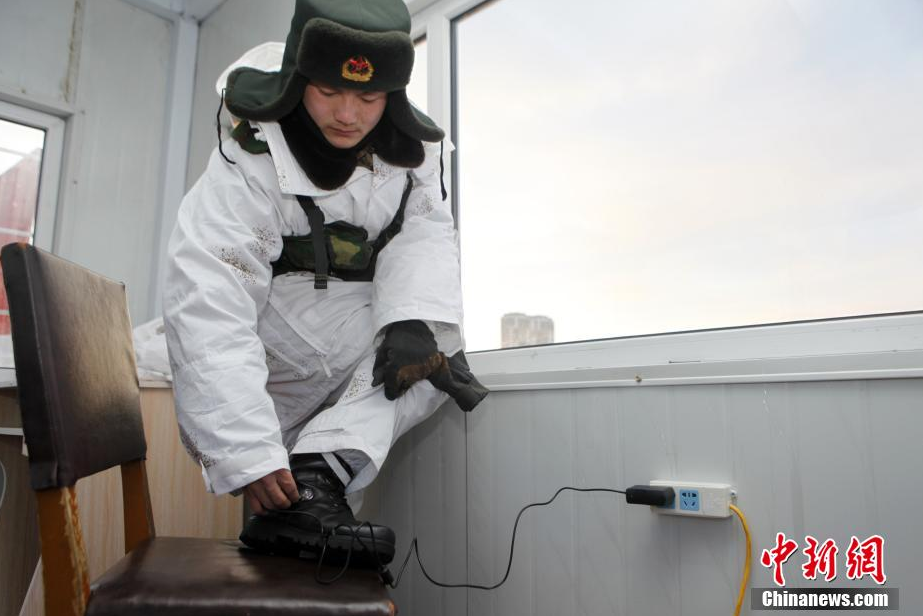 2015年1月11日,“黑河好八连”哨兵辛国强脚穿充电保暖皮鞋冒着零下30度严寒气温在中俄边境线上,为祖国母亲站岗。1月上旬,从网络上获悉“黑河好八连”哨兵不畏严寒为祖国站岗的感人事迹后,一鞋业公司“第一时间”免费为八连官兵邮寄过来100余双电热保暖皮鞋,该皮鞋具备在零下30度到零下60度极寒天气里充电一次保暖8到12小时的特点,而且重量轻,质感美观,不仅有效解决了哨兵高寒条件下站岗执勤时脚步御寒的难题,还大大提升了边防战士快反处突的机动能力。中新社发