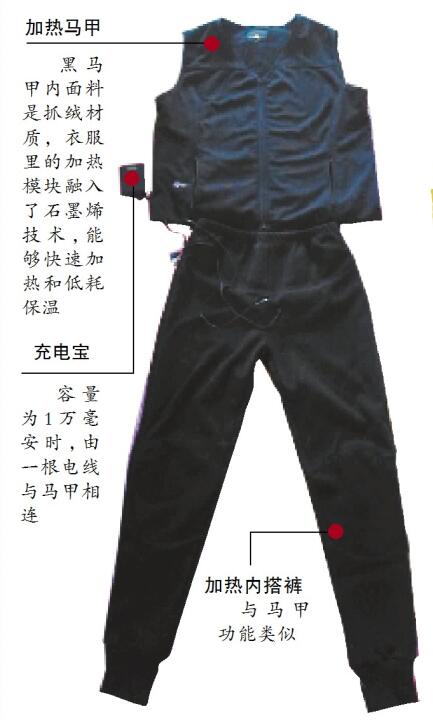 以前,环卫工人清扫、清雪作业,尤其在清晨气温最低时,里三层外三层穿得很厚依然觉得冷,每次出门都要在身上粘四五个热贴才行。自从去年12月份配发加热保暖服后,以往常穿的羽绒马甲换成加热服,热贴也不用再贴了。